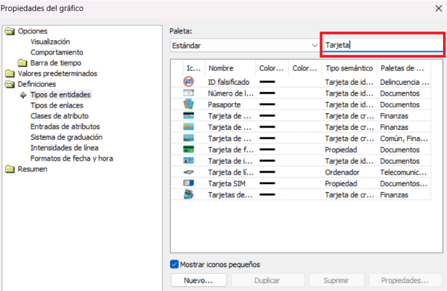 Dentro del cuadro de diálogo Propiedades del gráfico, ahora puede buscar en listas de tipos de entidades y enlaces, así como en clases de atributos y entradas, para simplificar la búsqueda del elemento de interés en listas largas.